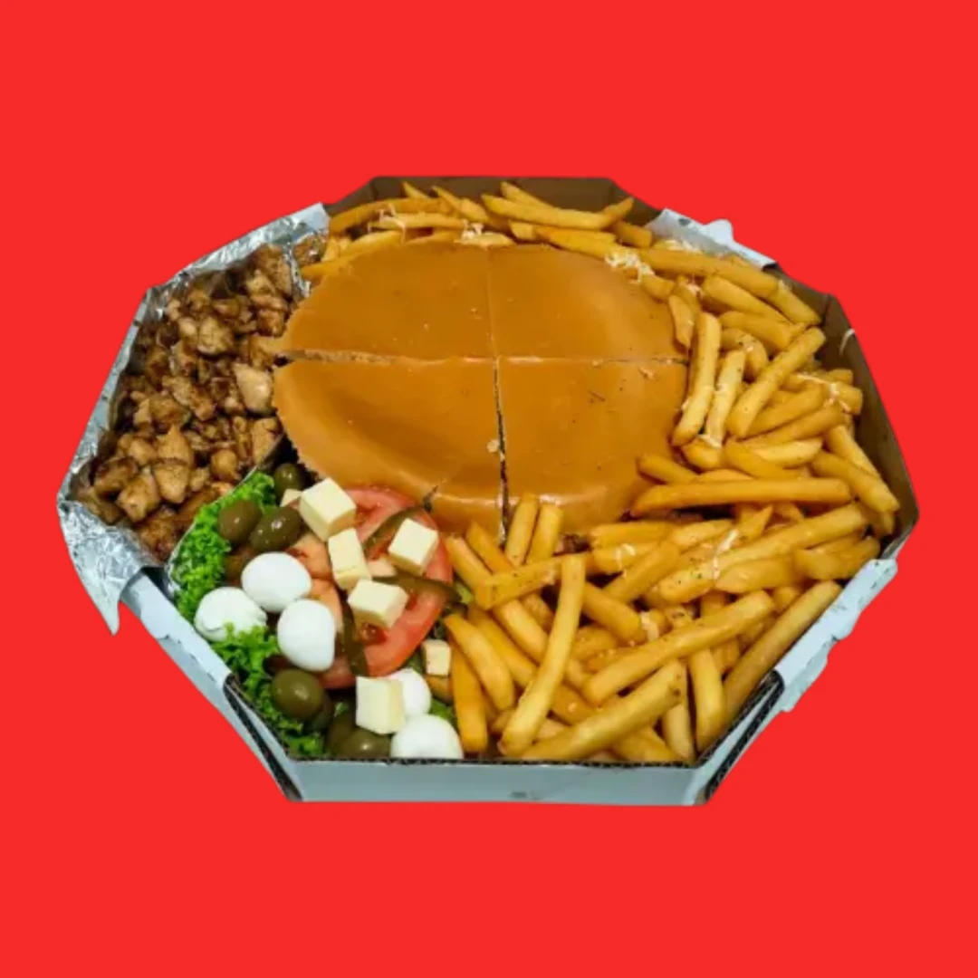 XIS: Maionese, tomate picado, milho verde e ervilha, frango desfiado com Bacon, hambúrguer smash artesanal, ovo, mussarela, presunto e alface + PORÇÃO de Batata Frita + PORÇÃO de Filé Mignon + FRIOS composta de alface, tomate, pepinos, ovos em conserva, azeitonas e queijo em cubos.