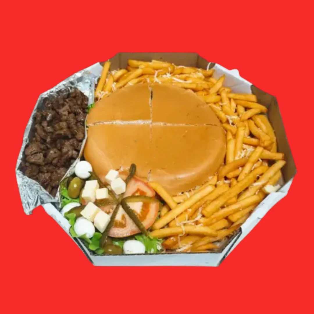 XIS: Maionese, tomate picado, milho verde e ervilha, hambúrguer smash artesanal, ovo, mussarela, presunto e alface + PORÇÃO de Batata Frita + PORÇÃO de Filé Mignon + FRIOS composta de alface, tomate, pepinos, ovos em conserva, azeitonas e queijo em cubos.